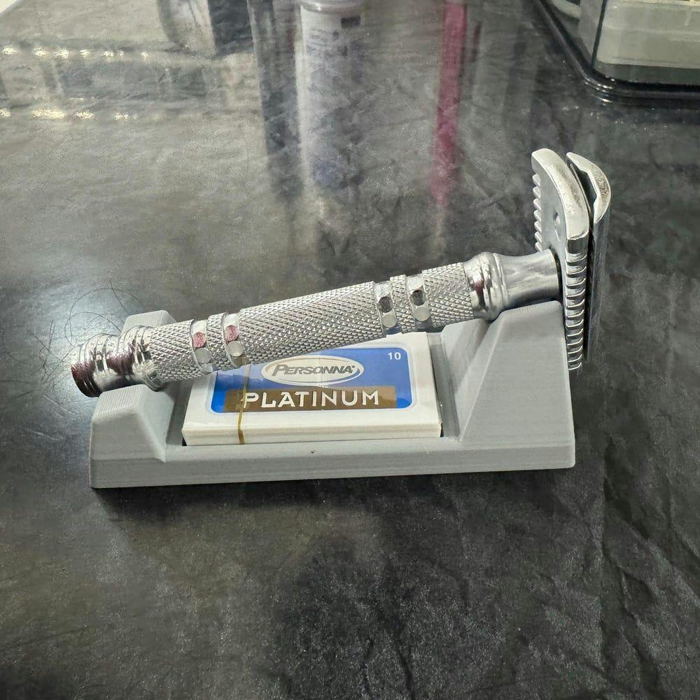 Got to say it's pretty well designed. The handle sits on it perfectly. And even without the head on, it will sit there and not slide off. I also appreciate that one of the sides of the interior walls where you keep the razor blades is angled, so it's easy to slide one out. Definitely a great way to store your razor in between uses.